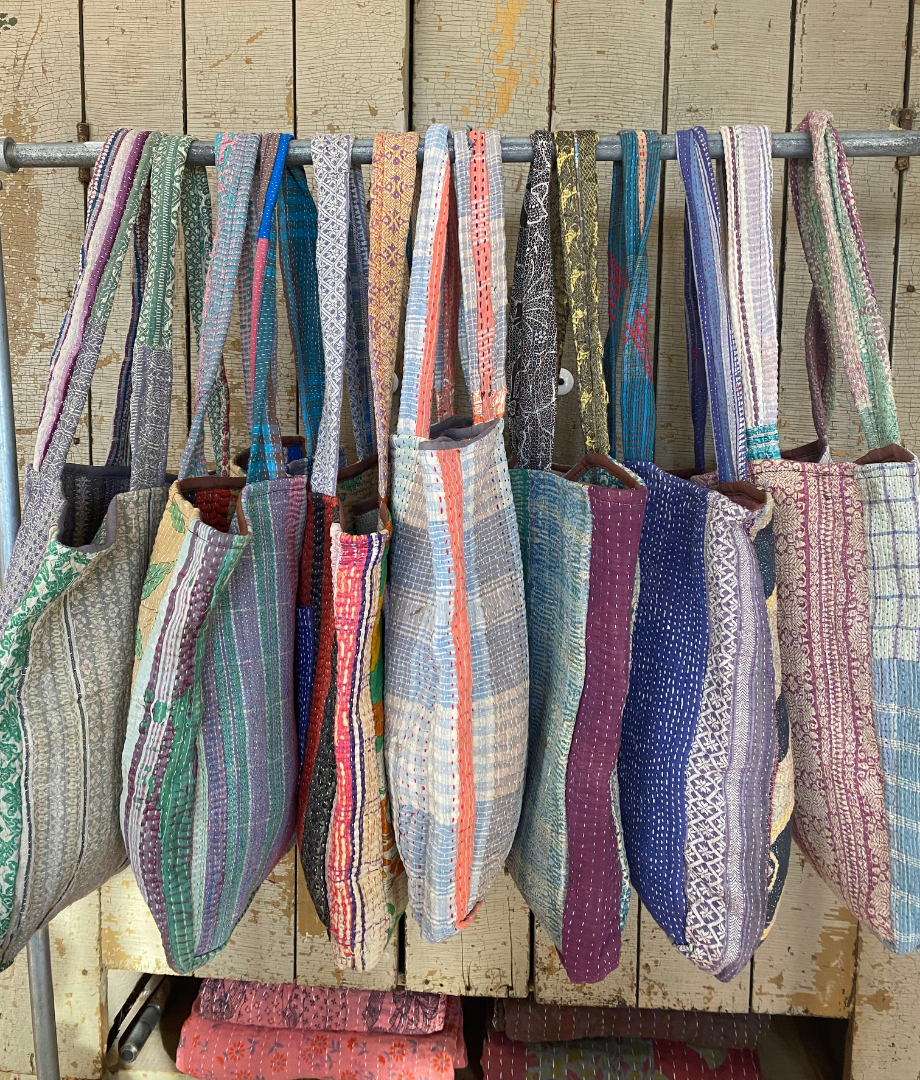 Kanthas are made from old, recycled saris that are hand stitched (this is the kantha stitch and where the name comes from) with multiple layers of saris.