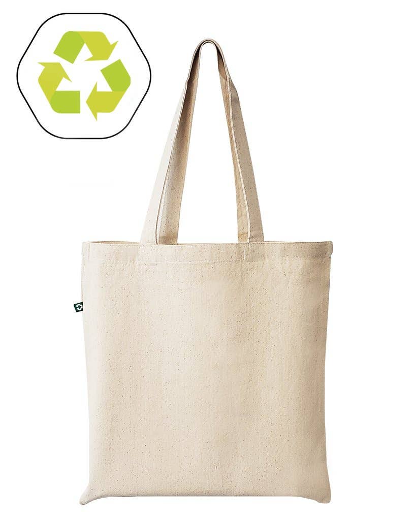 - MATERIAL: Eco-Friendly Recycled Canvas Tote Bags are made 100% Recycled fabric. - DESIGN: This Reusable Multipurpose Tote Bag has one spacious main compartment, bag has 21" soft seft-fabric handles so you can comfortably carry by hand or over your shoulder. Self-Fabric handles are reinforced with stress point stitching for durability and to carry a heavy load. It has a flat bottom. - MULTIPURPOSE: Eco-Friendly blank tote bags for grocery shopping, school, work, travel, gym, beach, church, custom DIY, art & crafts, decorations, weddings. Design your own customized tote bags to boast to recipients that this promotional use these as trade show giveaways and special event items. - SIZE: 15"W x 16"H, Imprint Size: 13"W x 14"H. Great for promotional needs, giveaways, DIY, daily use, advertising your business, and more. - Shop Eco-Friendly with our Recycled Canvas Tote Bag